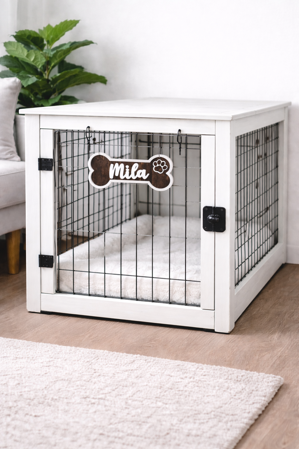 Our custom dog bone crate sign is the perfect accessory for all pet lovers! This adorable sign is designed to add a touch of elegance and charm to your furry friend's crate! Crafted with love and attention to detail, it features a playful dog bone shape that is sure to capture attention.